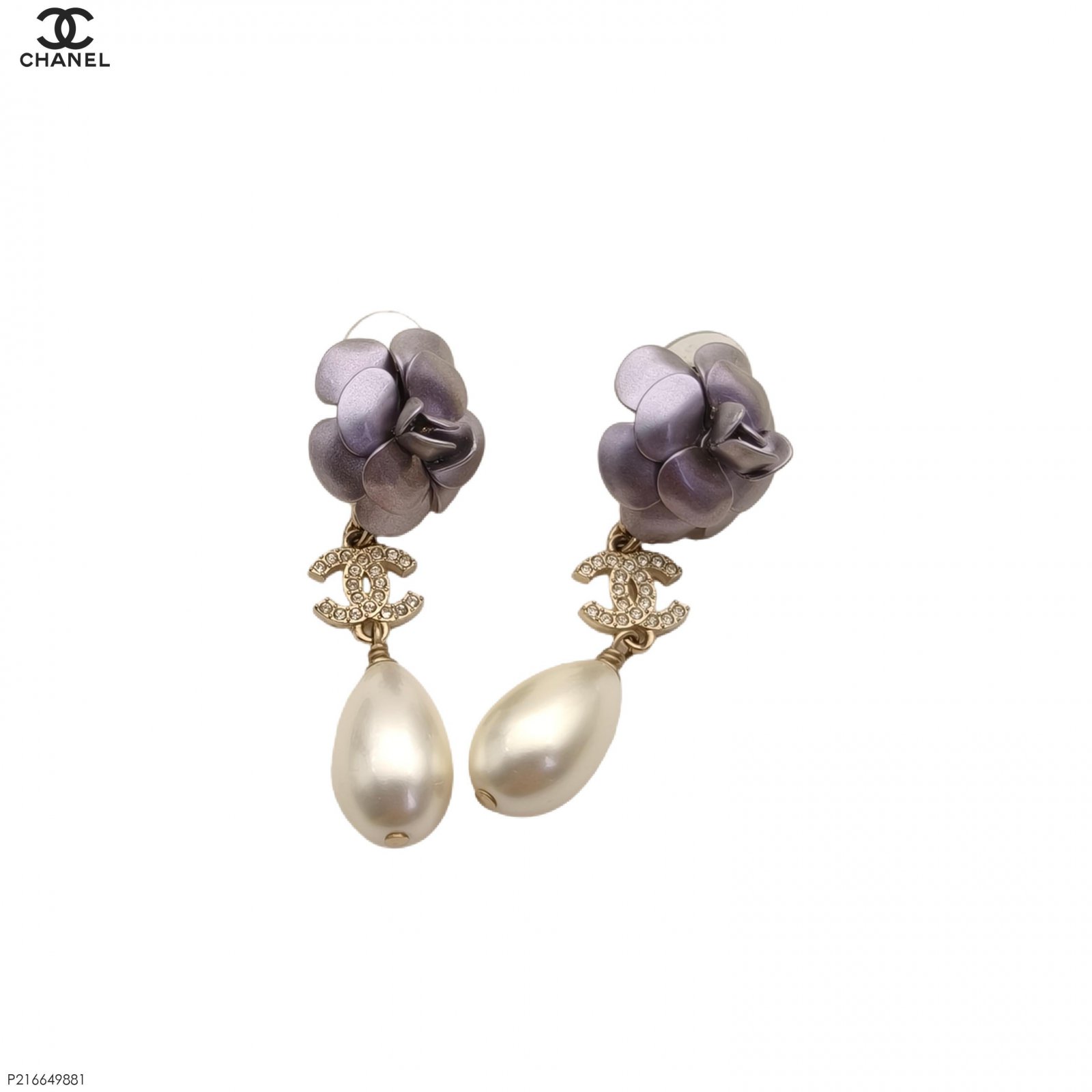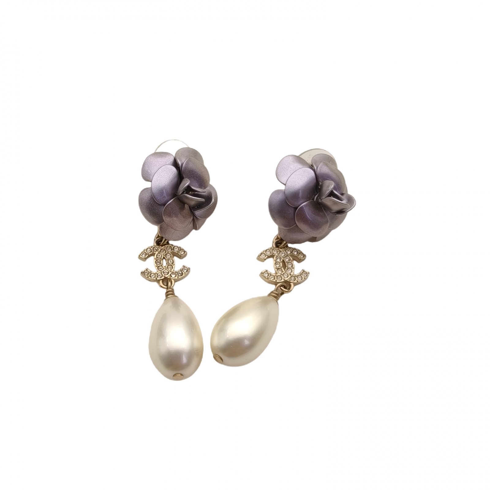 CHANEL 23C Camellia Pearl Water Drop Pendant Earrings Alloy