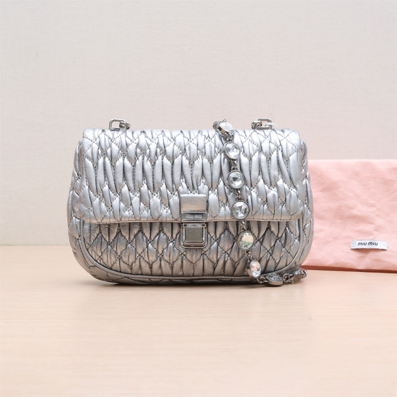 MIUMIU Black Silver Hardware Crystal Pleated Gemstone Chain Bag 34cm