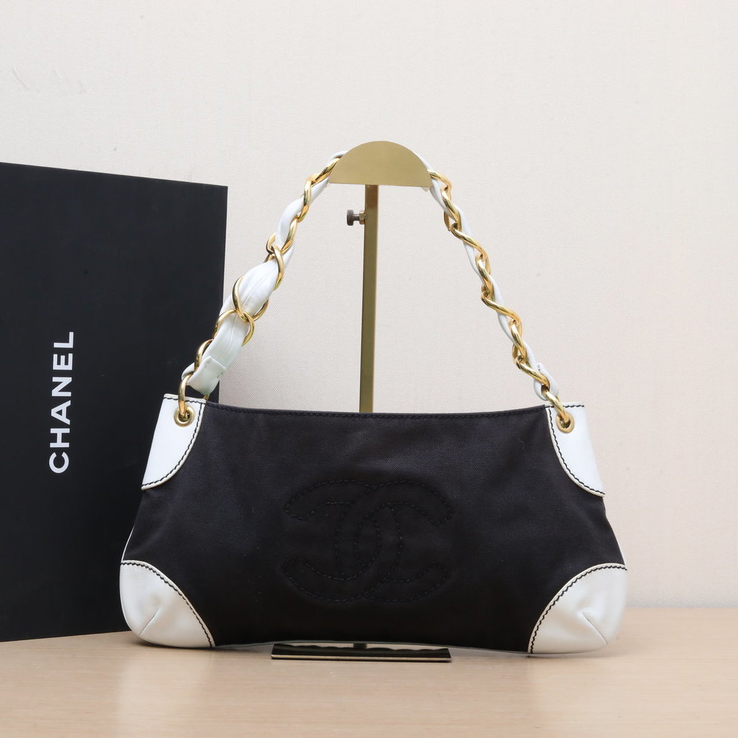 CHANEL Black and white canvas, 2004, Gold Hardware, Vintage, Shoulder Bag, Panda color scheme, Thick leather with chain
