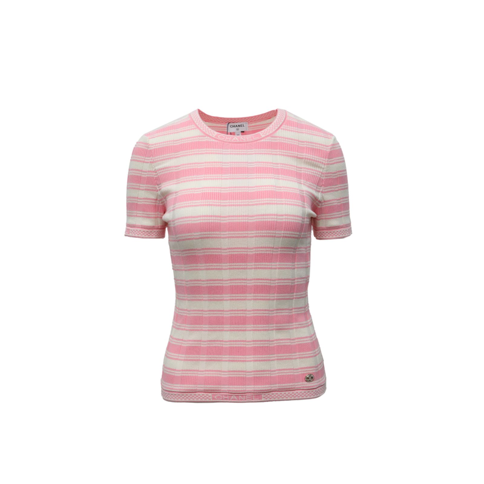 CHANEL Pink Nylon 23C Spring Vacation Collection Contrast Stripe Short Sleeve 34