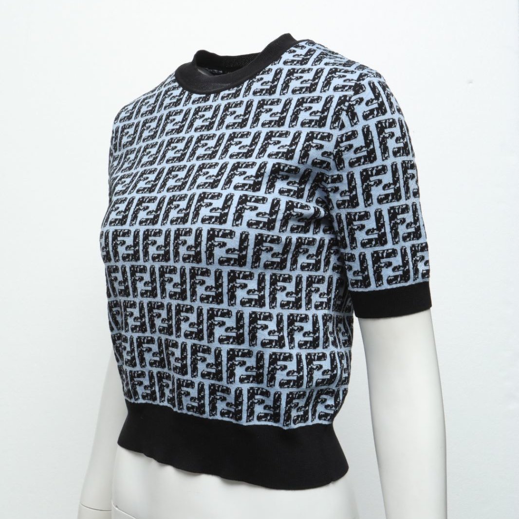 FENDI Blue Black Nylon Double F All-over Print logo Knit Short Sleeve 36