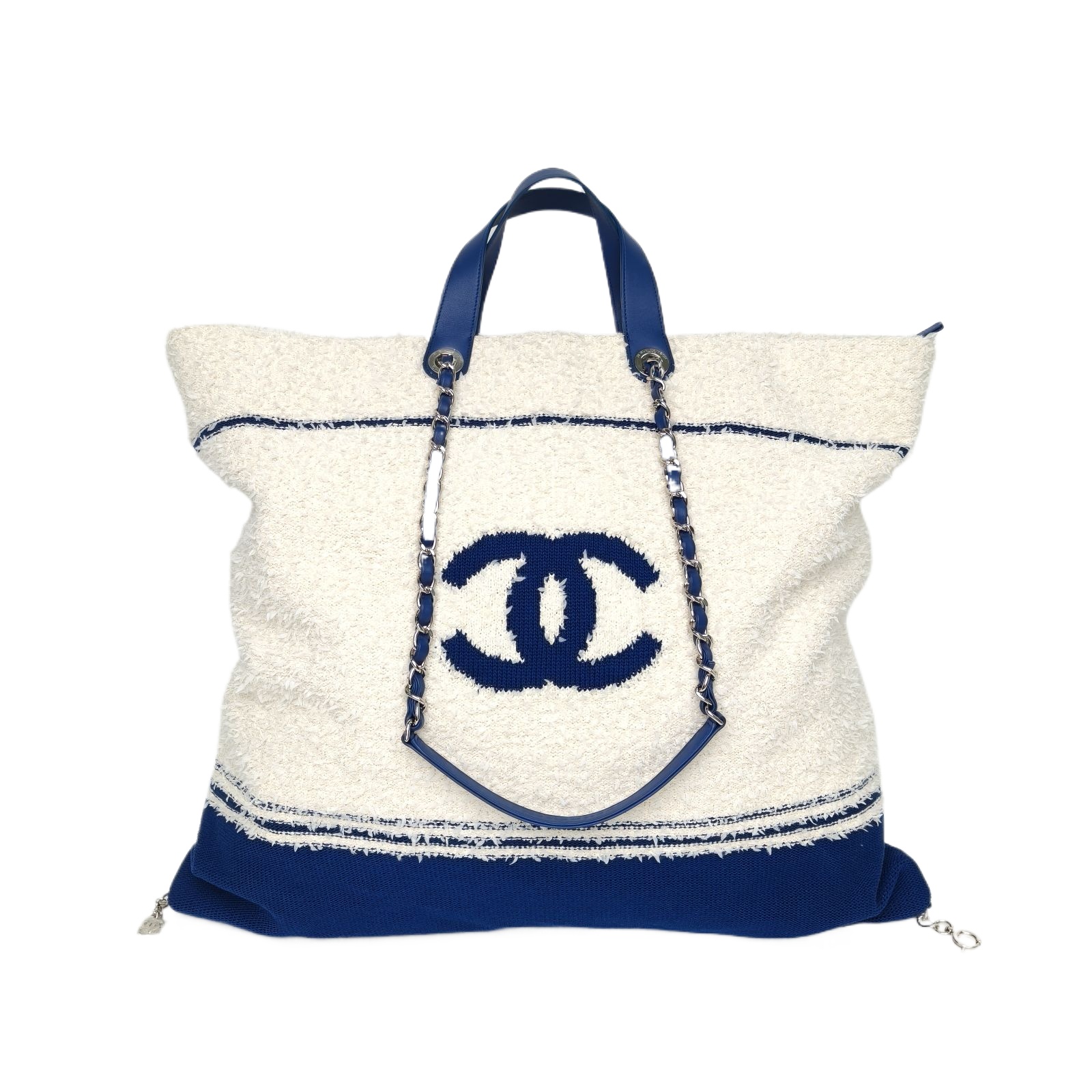 CHANEL Color Block Wool 2019 Sliver Hardware Letter Logo Terry Cloth Beach Bag With Handle Shopping Bag Large