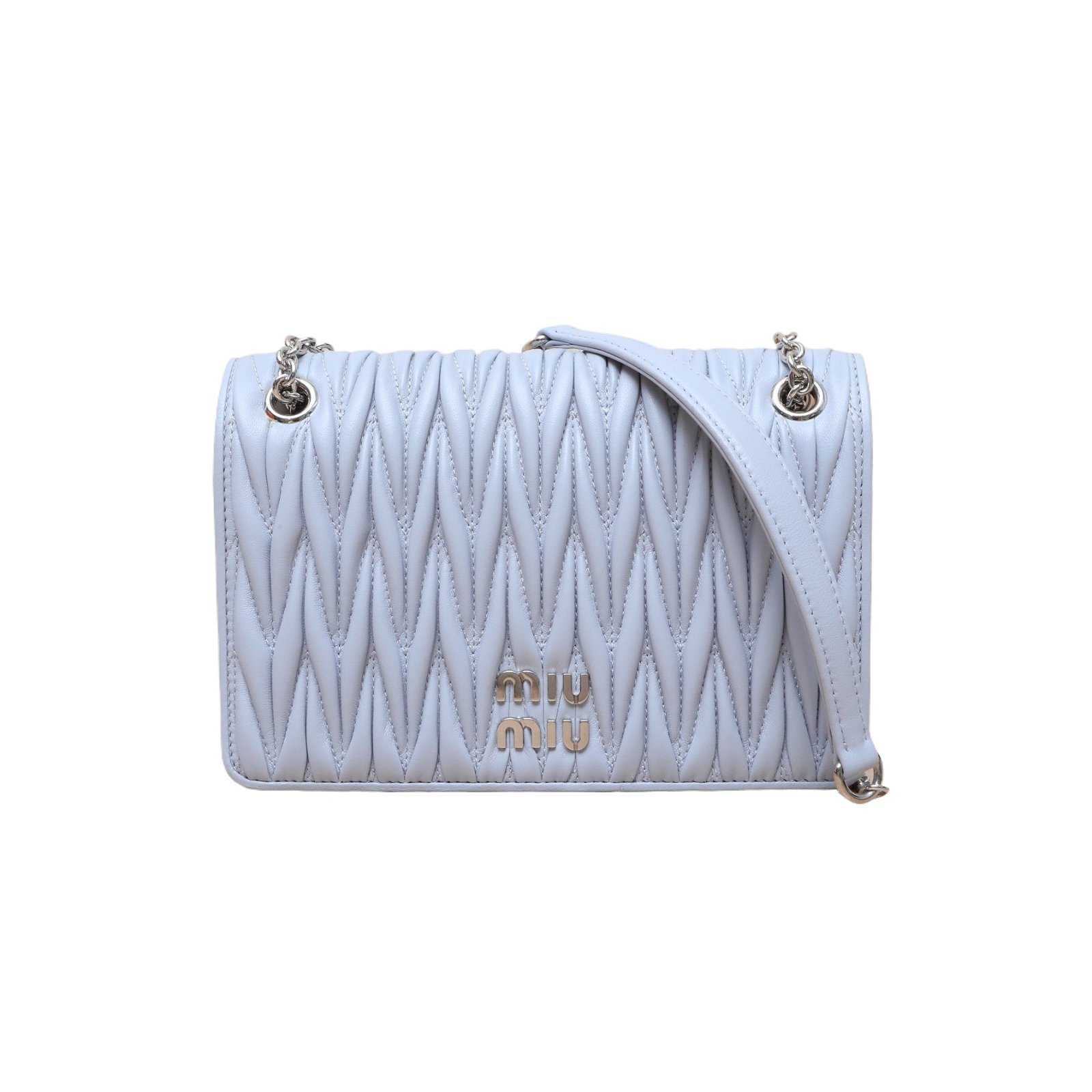 MIUMIU Light blue Leather S Matelasse Series, Wrinkled Metal LOGO, Crystal Chain Logo, Crossbody Bag, New Style