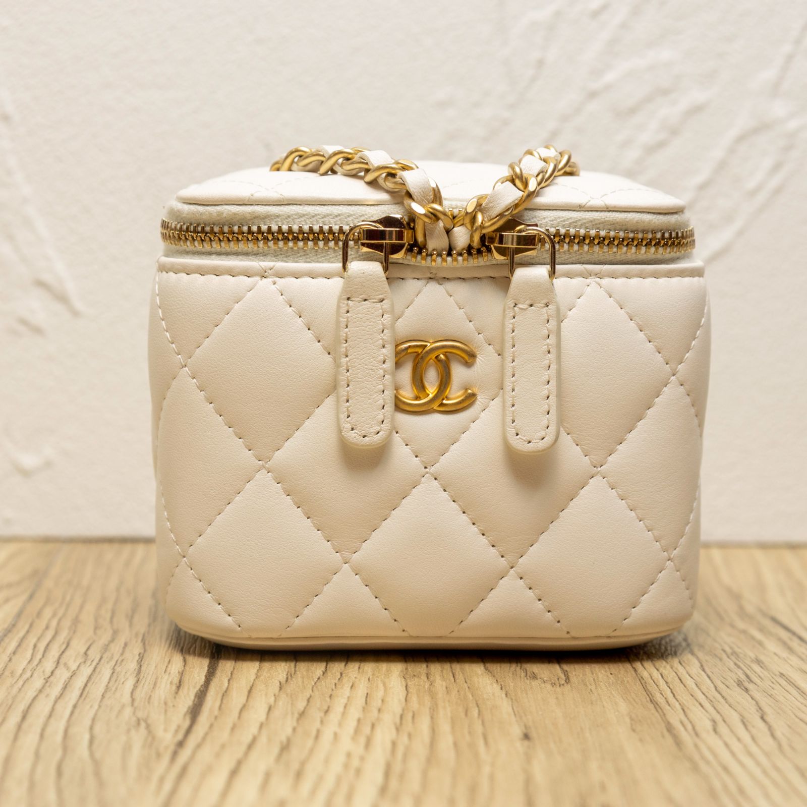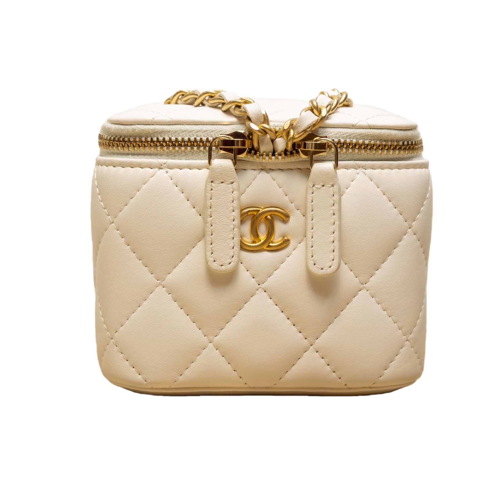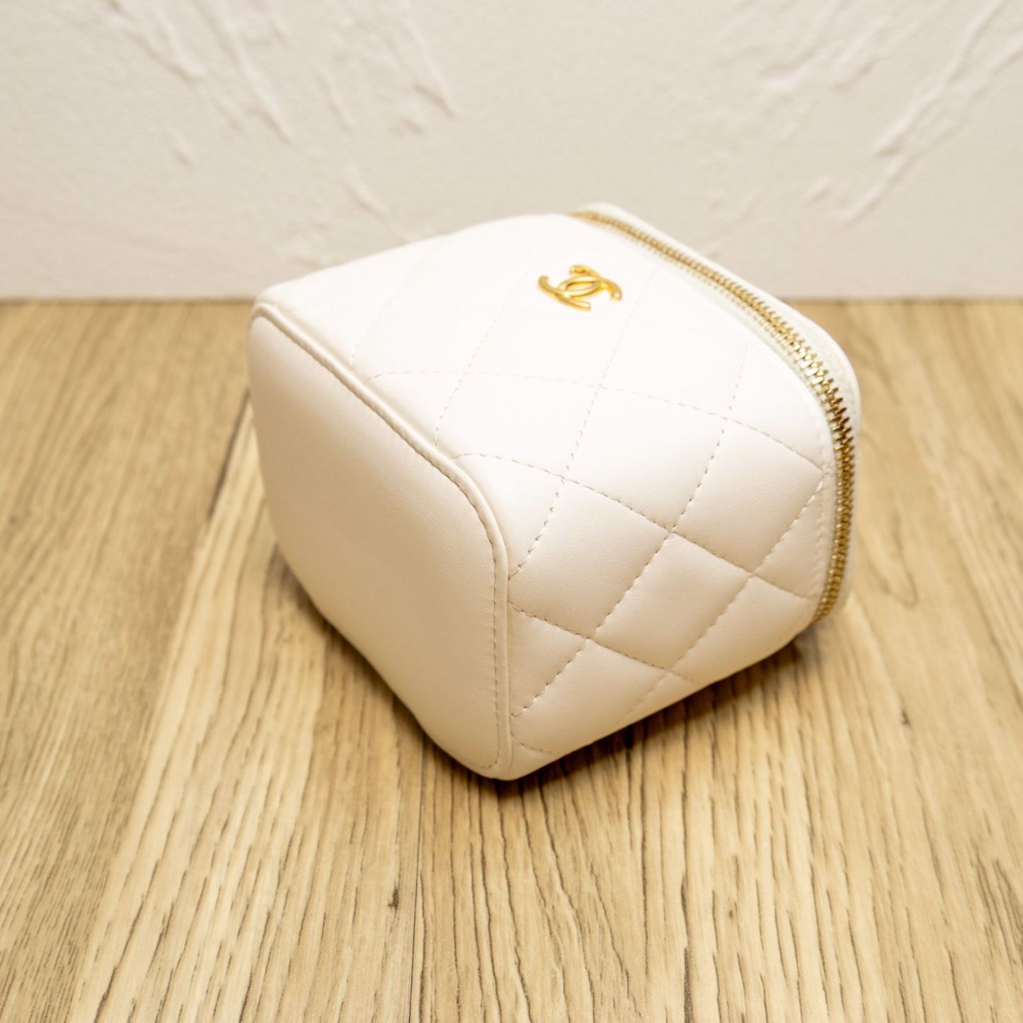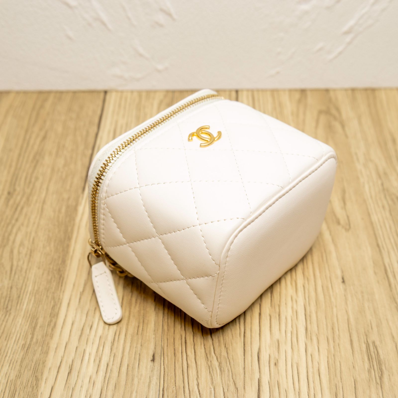 CHANEL White Square Cosmetic Bag with Mirror, 11cm, Gold Ball, 2021