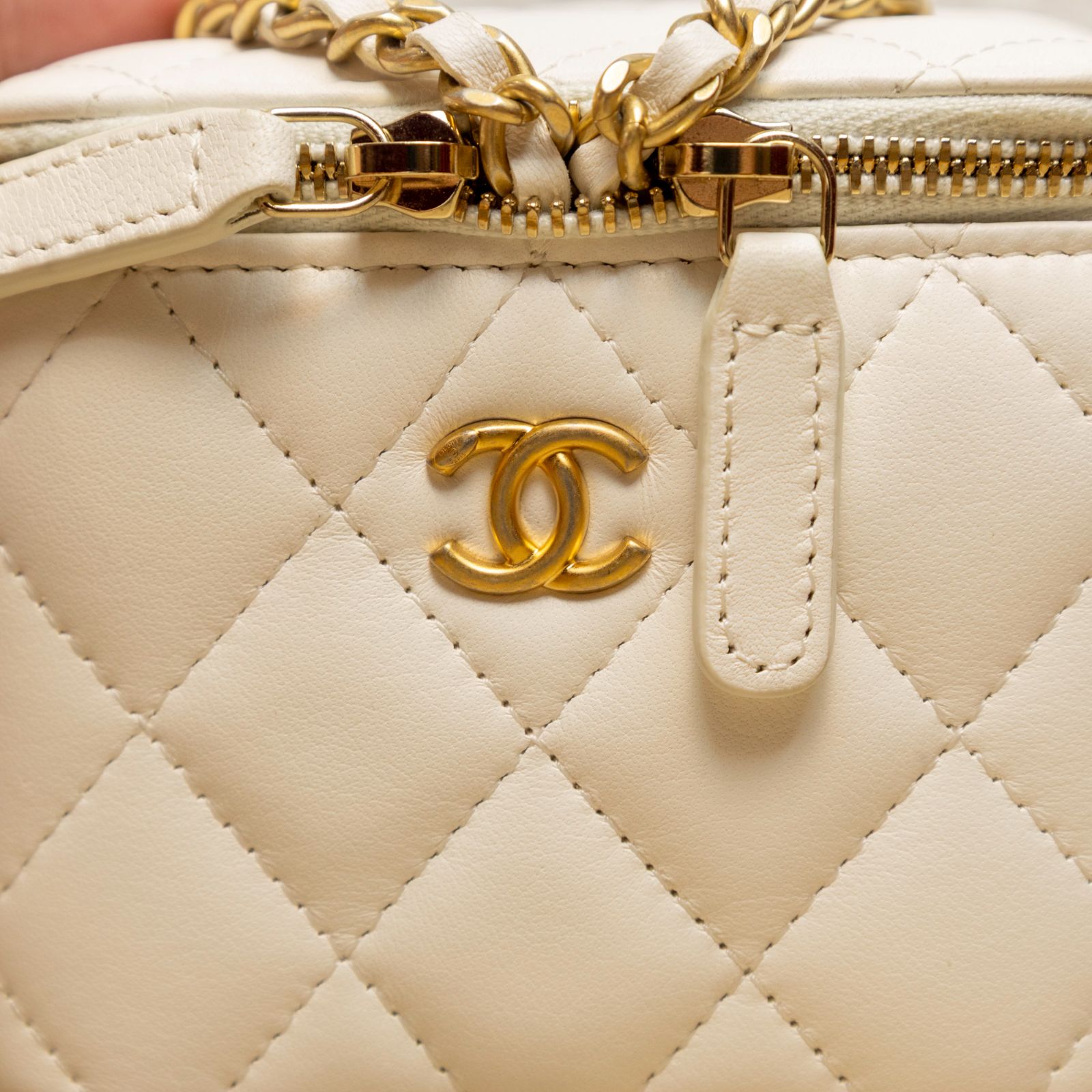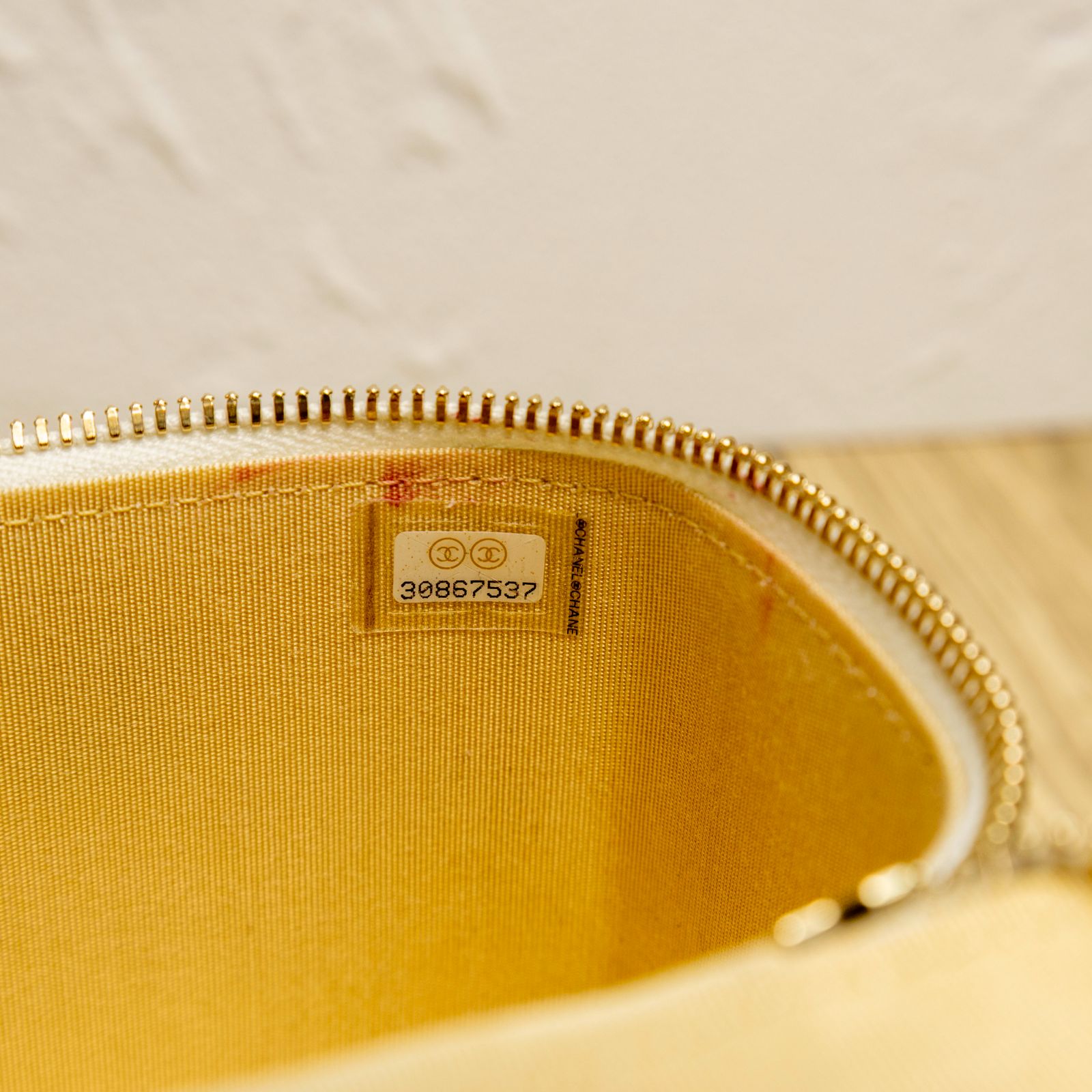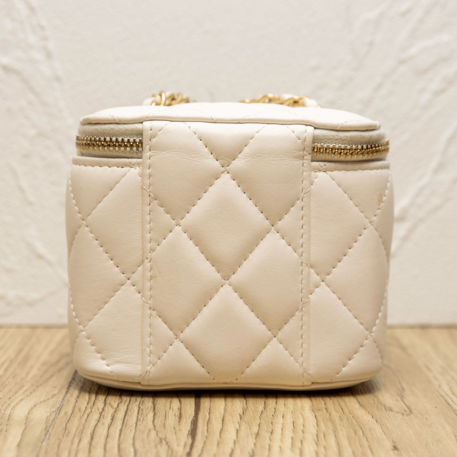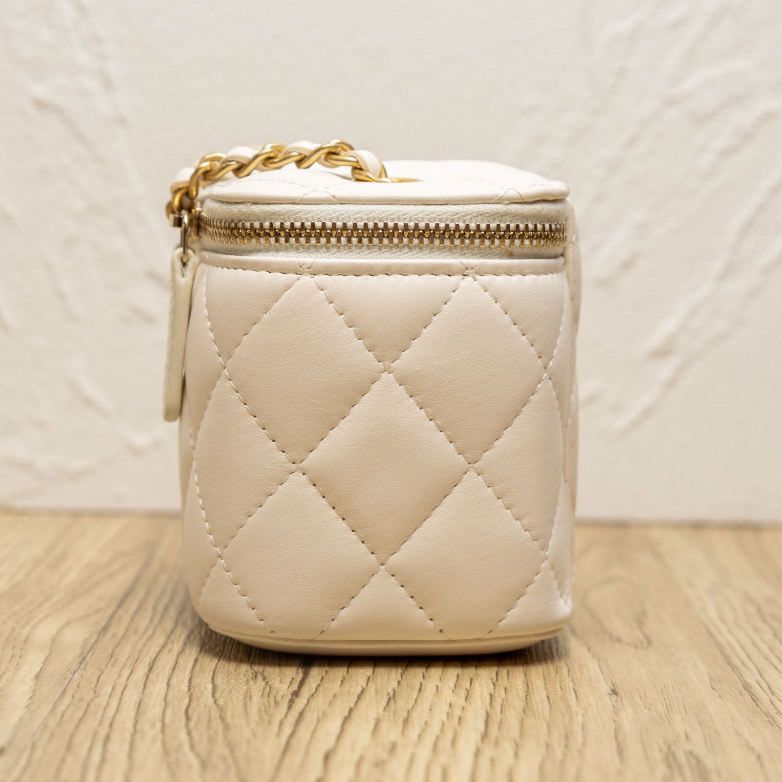 CHANEL White Square Cosmetic Bag with Mirror, 11cm, Gold Ball, 2021