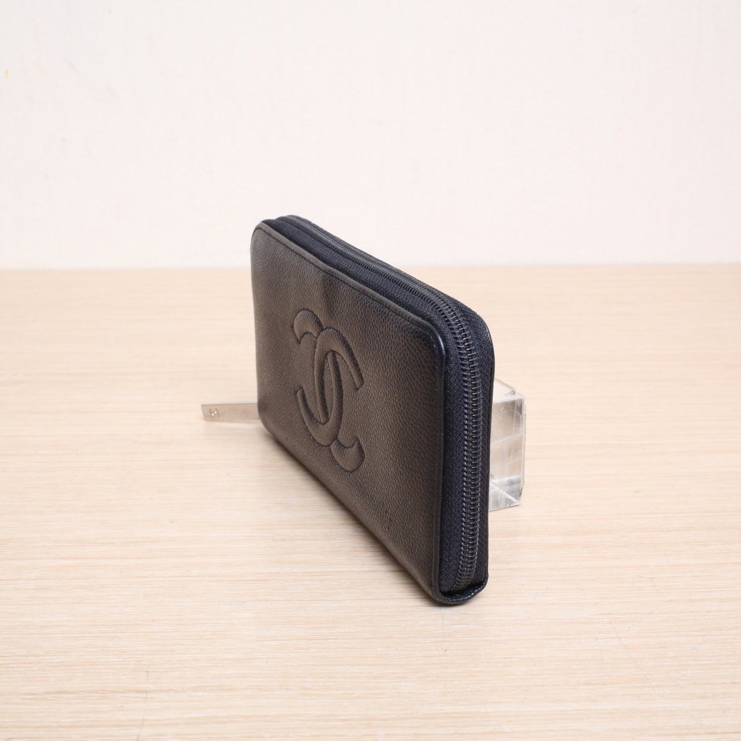 CHANEL Black 2012 Sliver Hardware Double C Embossed Logo Zip Long Wallet