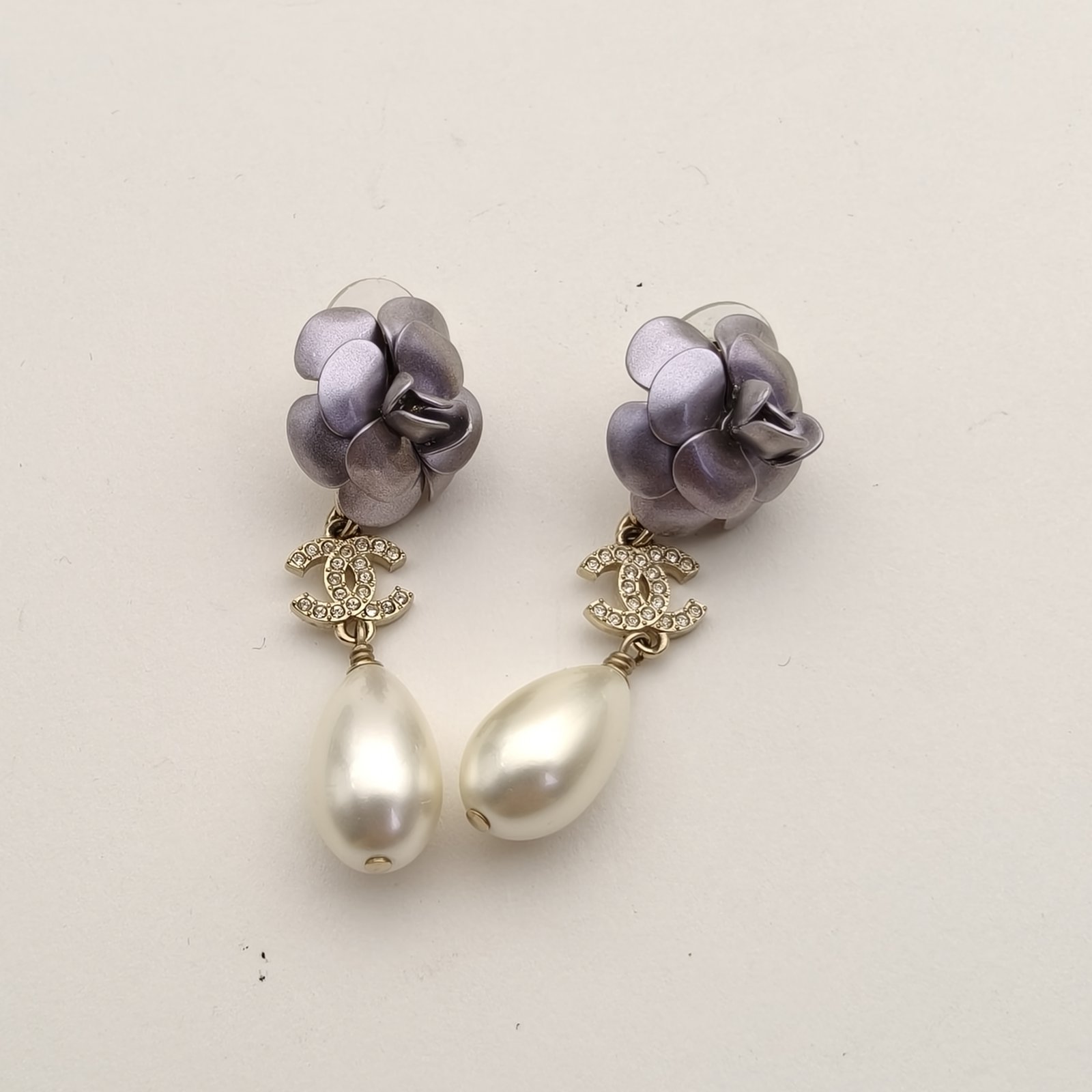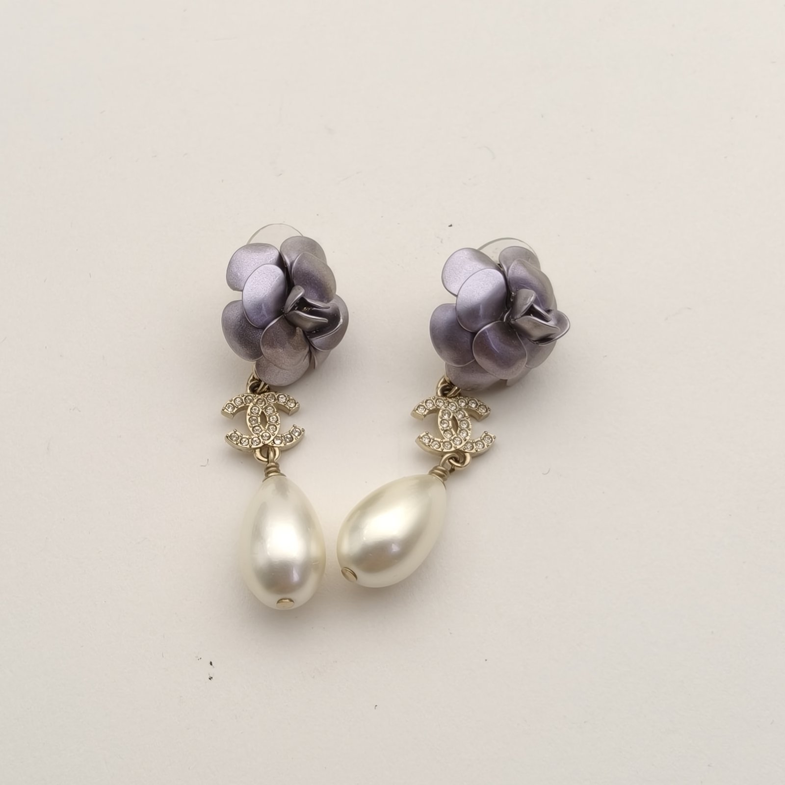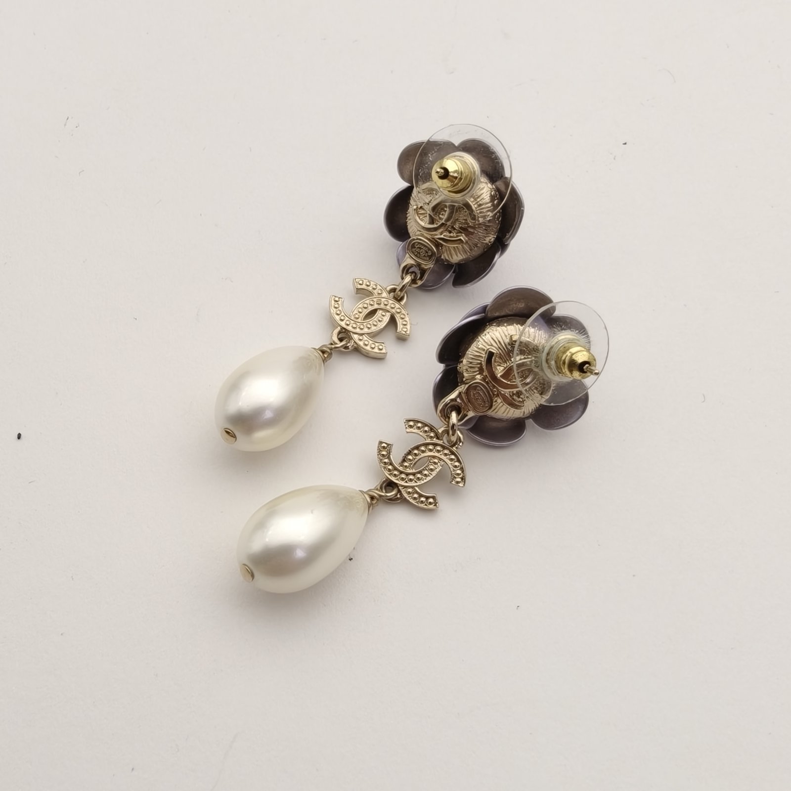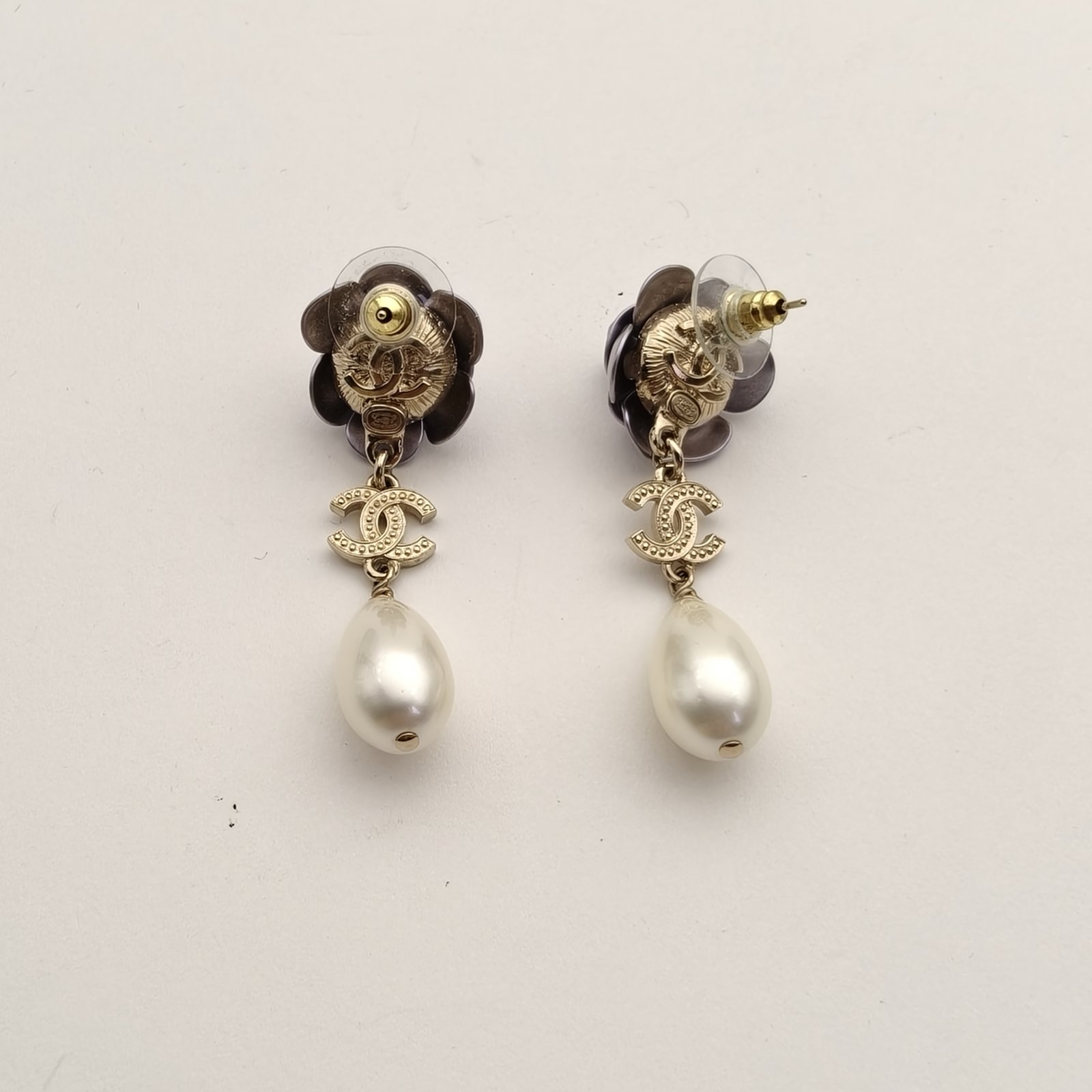 CHANEL 23C Camellia Pearl Water Drop Pendant Earrings Alloy