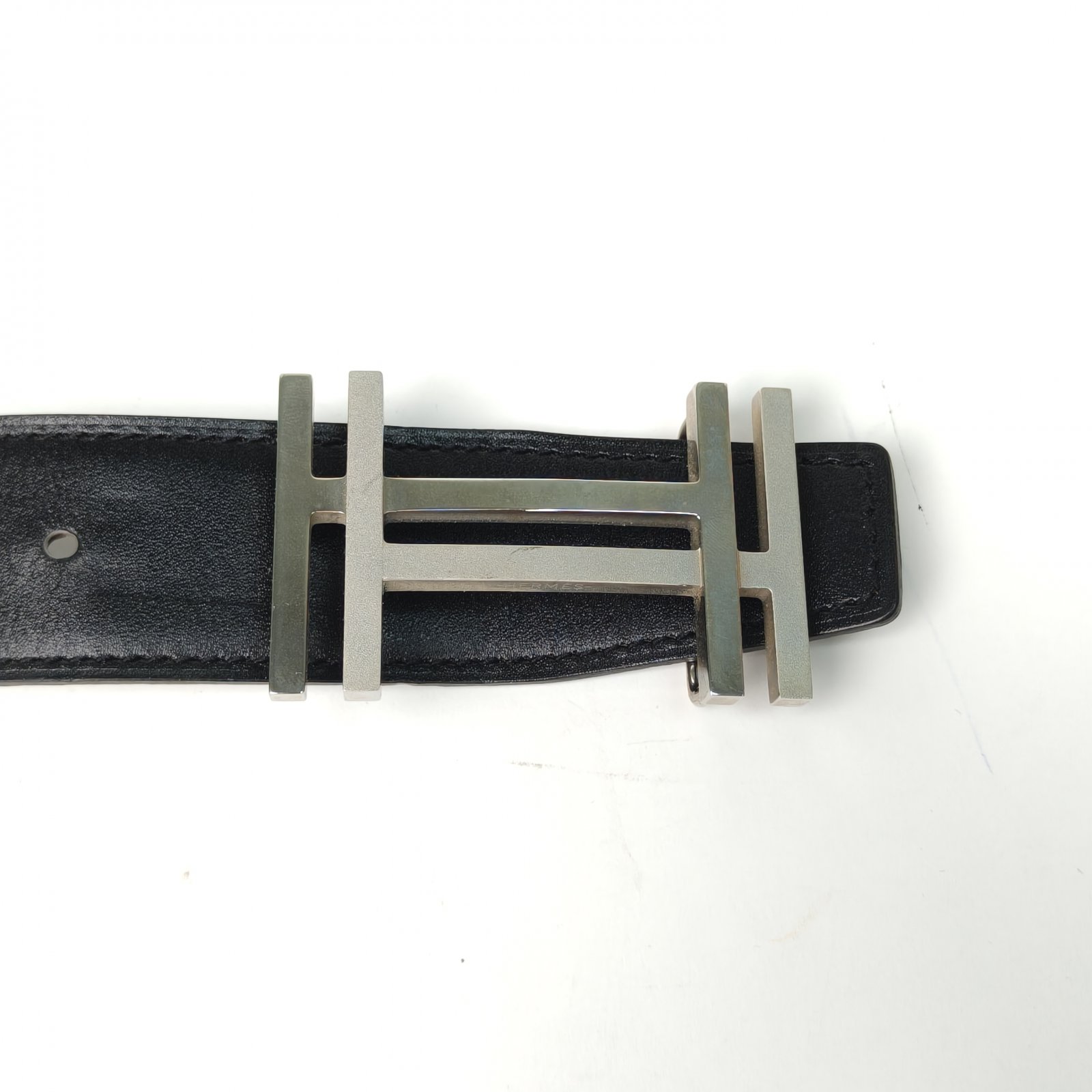HERMES 89 Black 46 Ebony Frame Q Silver Buckle double H Reversible Belt Patchwork
